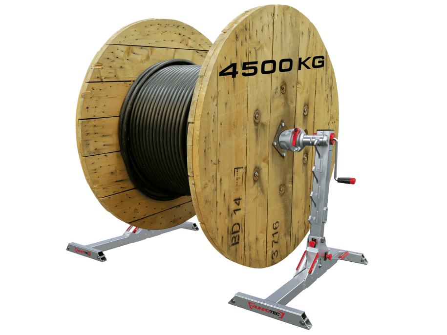 Zona optimă de aplicare: Pentru ridicarea și apoi derularea tamburelor de cablu până la Ø 1600 mm, lățime 1250 mm și o greutate maximă de 4.500 kg (numai în combinație cu RUNPOLIFTER 4500)