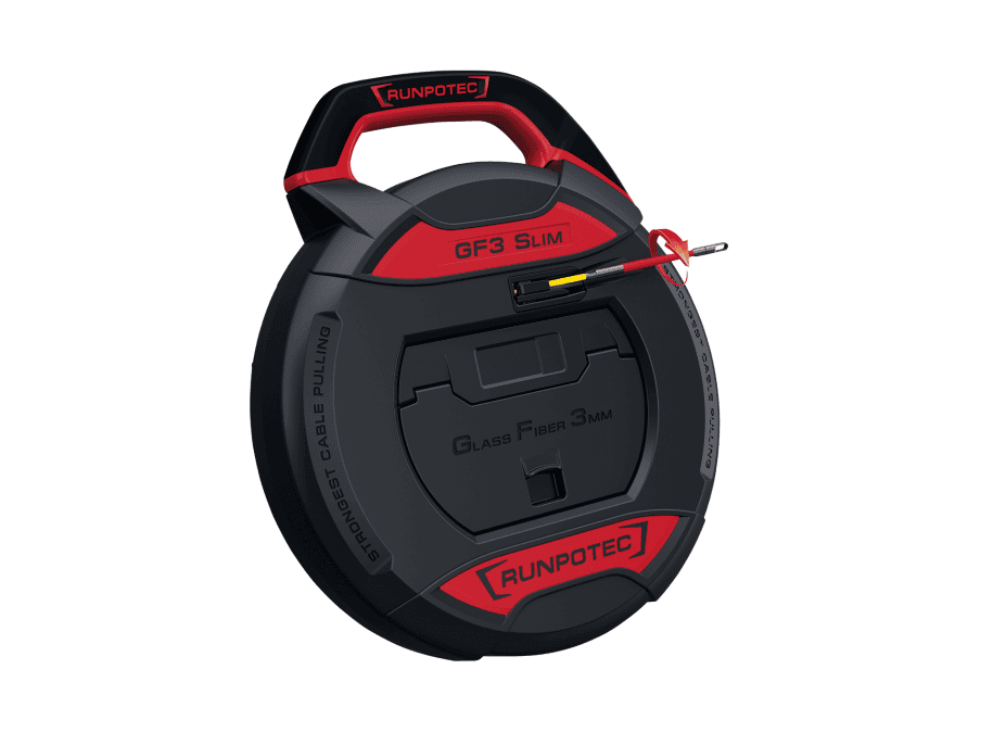 GF3 SLIM – tija din fibră de sticlă Ø 3 mm este un instrument de tragere a cablurilor care include un contor digital (pentru determinarea lungimii țevilor/cablurilor sau pentru crearea listelor de cabluri). Cu un diametru maxim de doar Ø 4,5 mm, este ideal pentru montarea ulterioară a țevilor ocupate sau pentru pozarea cablurilor de fibră optică (FTTH – Fiber To The Home). Tija din fibră de sticlă Ø 3 mm cu cap de ghidare brevetat RG4.5 inclusiv pivotant este depozitată într-o cutie de plastic extrem de rezistentă la șocuri. Unitatea de măsură a contorului poate fi schimbată de la Metric (m) la Imperial (ft). Cu noul cap de ghidare RG4.5 cu filet frontal RTG Ø 3 mm inclusiv pivotant, este posibil să depășiți razele de îndoire până la R = 40 mm. Protecția automată pentru spate previne alunecarea accidentală a tijei din fibră de sticlă înapoi în cutie. Cutia poate fi deschisă pentru lucrări de service cu un singur șurub pe spate. Acest lucru permite și cutia de accesorii integrată, care conține un set de accesorii din 14 piese, să fie îndepărtată. Filetul adaptor inclus cu filet interior RTG Ø 3 mm la filet exterior RTG Ø 6 mm permite multe combinații posibile. Cutia are, de asemenea, un mâner de transport ergonomic și un strat anti-alunecare pe spate. Sarcina totală de rupere de 100 kg se referă la tija din fibră de sticlă Ø 3 mm inclusiv cap de ghidare RG4.5 cu compensare de răsucire.