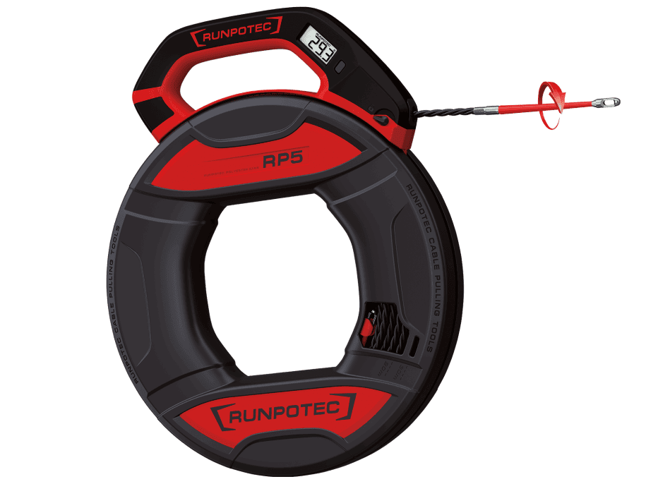 Banda de plastic specială triplu răsucită cu diametrul de 5,5 mm are un efect de forfecare și mai bun decât tija din fibră de sticlă de 3 mm; rezistența la frecare este doar jumătate din valoarea normală din cauza contactului punctual. Capul de ghidare patentat RG7 cu pivotant Ø 5,5 mm (presat la inceputul si la sfarsitul benzii) permite depasirea razelor stranse (raza de indoire 15 mm). RP5 – RUNPOTEC Poliester Ø 5,5 mm este depozitat într-o cutie de depozitare adecvată și robustă la șantier, cu un mâner de transport ergonomic. Este echipat cu noua protectie pentru spate, care previne alunecarea accidentala a curelei de tragere a cablului. Unitatea de măsură a contorului poate fi schimbată de la metric (m) la imperial (ft). Sarcina totală incredibilă de rupere de 270 kg se referă la întregul sistem de tragere. Lucrările de reparații care necesită timp și forță de muncă nu mai sunt necesare, deoarece acest sistem de tragere a cablurilor este practic fără rupere. RP5 este disponibil în lungimi de 20 m și 30 m. Cureaua de schimb RP5 nu poate fi depozitată în cutie.